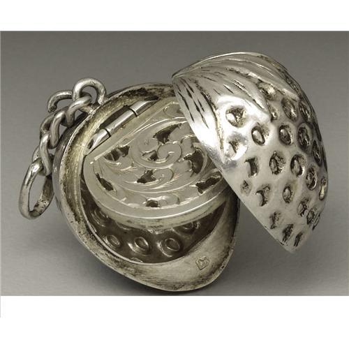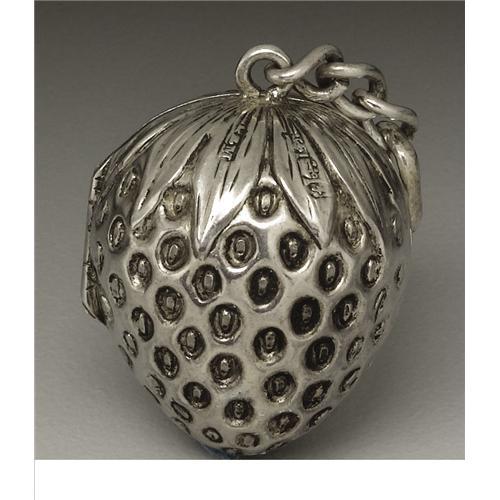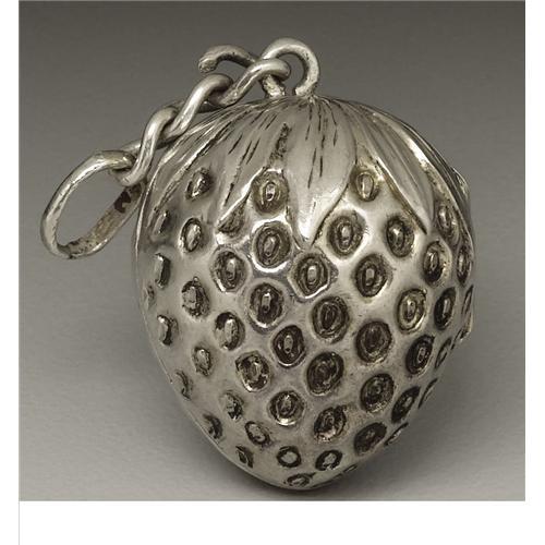 <B>A Victorian Silver Vinaigrette</B></I><BR><BR>Unkown maker, Birmingham, England<BR>1883-84<BR>Silver<BR>Marks: (lion passant), (anchor), <I>i, ...&M</B></I><BR>.87 in. long, .18 troy ounces<BR><BR>In the form of a strawberry, with scroll pierced grill. Loop with chain.
