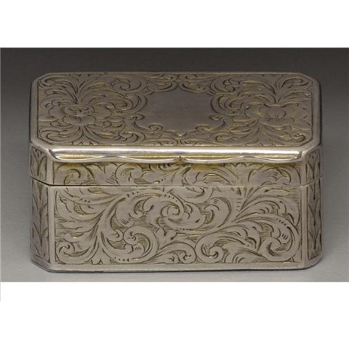 <B>A Victorian Silver Vinaigrette</B></I><BR><BR>S. Morgan & Co., London, England<BR>1861-62<BR>Silver and silver gilt<BR>Marks: (lion passant), (leopard's head), (monarch profile), <I>SM, f, S. MORGAN & CO MAKERS</B></I><BR>1.37 in. long, .64 troy ounces<BR><BR>With foliate etched decoration; pierced scroll design grill. Silver gilt interior. <BR><BR><B>Important notice:</