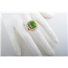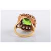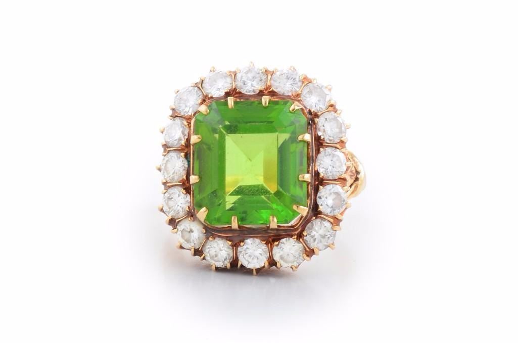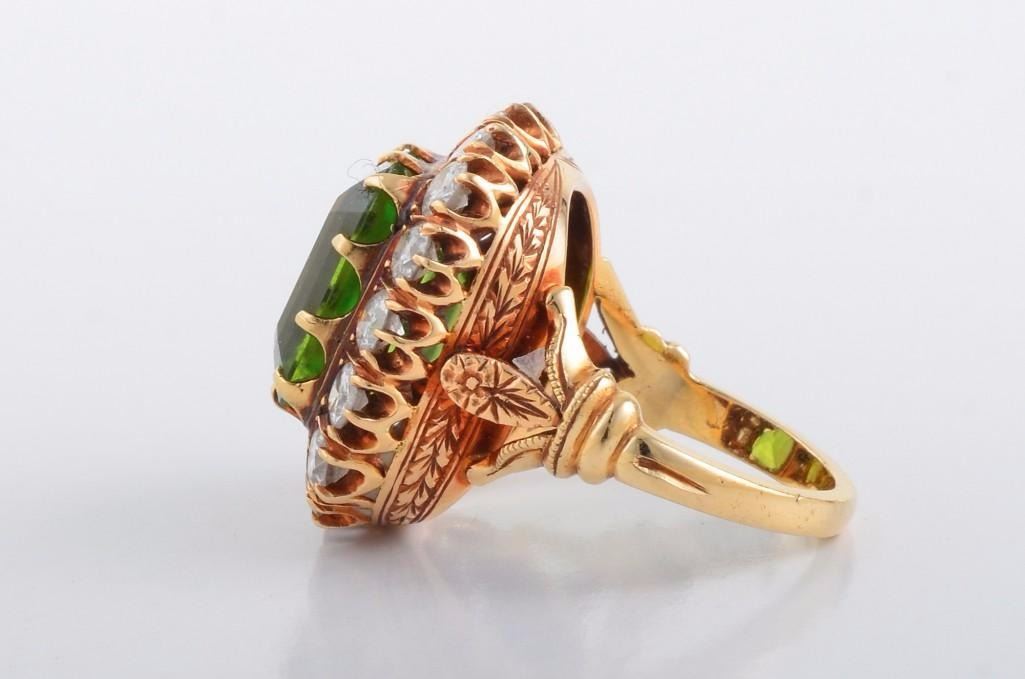 A beautifully made bishop's ring with a large vibrant peridot weighing approximately 7.00 carats, surrounded by 16 round cut diamonds weighing approximately 2.4 carats total. The mount is engraved with a leaf scroll design. 14K. Ring size approximately 6 3/4. Total weight 11g