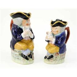 A Victorian Toby jug, seated gentleman in blue coat holding a jug of ale, (11in.) and a matching smaller Toby jug, (9 in.), both restored £120-180
