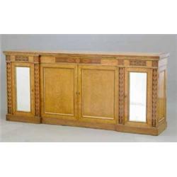A Victorian birds eye maple side cabinet by T & G Seddon, with scrolling anthemion inlaid decorated top and frieze with two panelled doors flanked by leaf inlay and two mirrored doors on breakfront plinth base, 7ft. £15,000-20,000