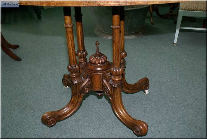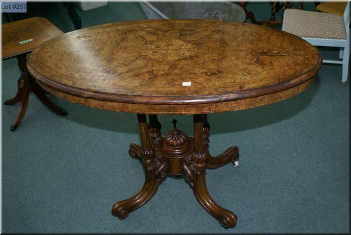 A Victorian burl walnut splayed leg occasional table with inlaid foliage and original porcelain castors