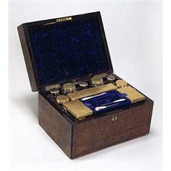 A Victorian burr walnut rectangular dressing and jewellery box by Carlisle & Watts, Edinburgh, the hinged lid with a rectangular plaque enclosing a fitted interior with gilt metal topped glass bottles and boxes, with a concealed drawer to the base , 18 high x 31cm wide (some cracks)