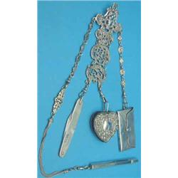 A Victorian cast silver chatelaine fitted with later accessories comprising a heart shaped pin cu...