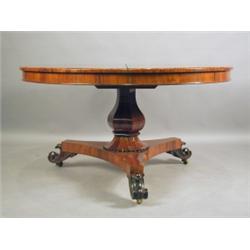A Victorian circular rosewood dining table, the top on a hexagonal baluster column and a large triform base, with carved scroll feet, 1.32m diameter