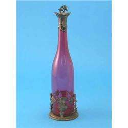 A Victorian cranberry glass decanter, with silver collar and plated stopper and stand, decorated with fruiting vines, Sheffield 1892, 15ins £150-200