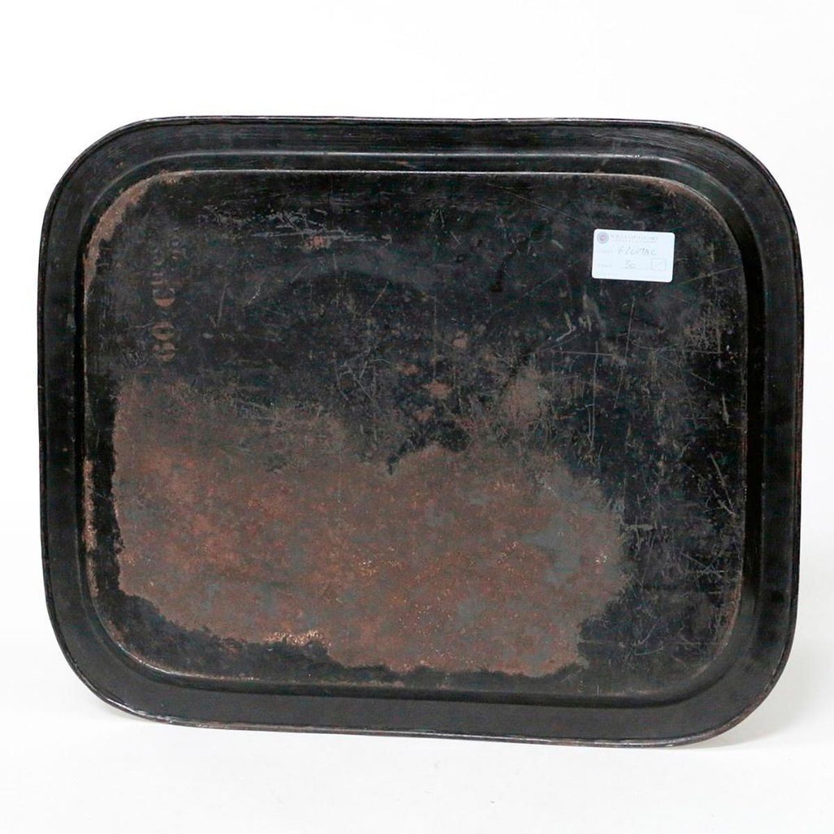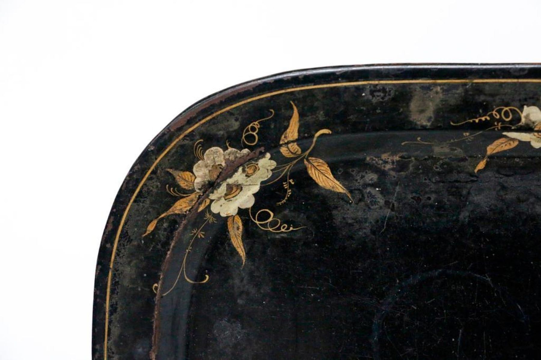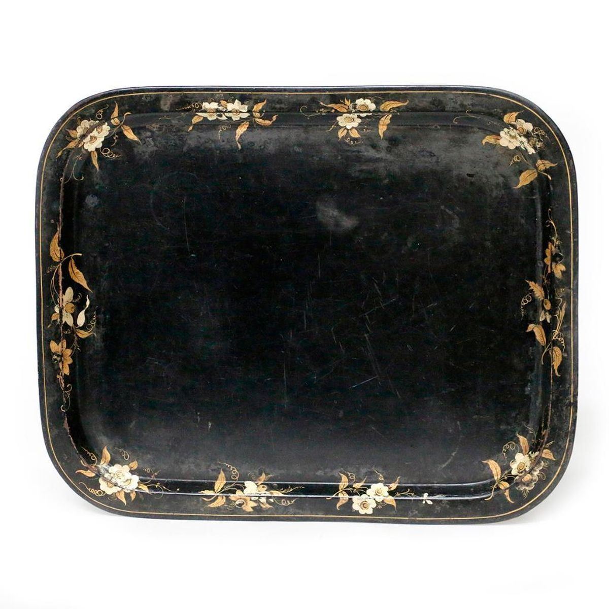 A 19th century English Victorian ebonized and gilt painted tole tray measuring 24 1/2 inches wide x 19 3/4 deep.
