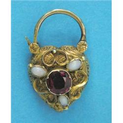 A Victorian engraved gold memorial padlock clasp, the front set with an amethyst and 3 opals...
