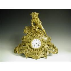 A Victorian gilt bronze mantel clock, with a figure of a harvester, and a striking French drum...
