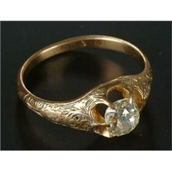 A Victorian gold and diamond solitaire gypsy ring, the old-cut stone approx. 0.57cts, claw set between foliate scroll engraved shoulders, indistinct hallmarks
