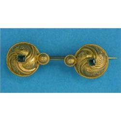 A Victorian gold bar brooch, designed as 2 emerald set bosses with wirework decoration £50-70