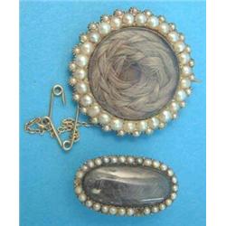 A Victorian gold circular mourning brooch, the plaited hair compartment bordered by 2 rows of split pearls, together with a similar oval mourning brooch £150-200