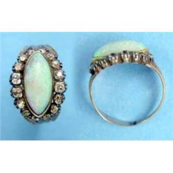 A Victorian gold cluster ring, set with a navette shape opal, bordered by a line of diamonds...
