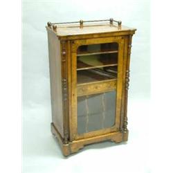 A Victorian inlaid figured walnut music cabinet with glazed door enclosing shelves, drawer and di...