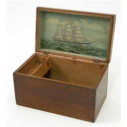 A Victorian mahogany box, with a painted view of a tall ship at sea on the interior of the lid, image bearing initials RB, 12 ins £100-150