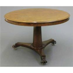A Victorian mahogany breakfast table, with gun barrel column on platform base with carved lion paw feet 3ft 5ins £250-300