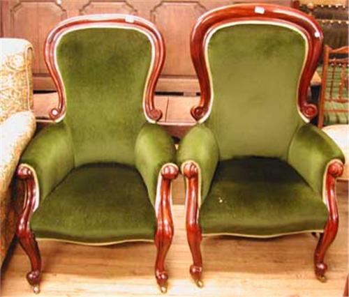 A Victorian mahogany framed gentleman's spoon back armchair with matching lady's armchair