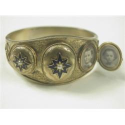 A Victorian memorial hinged bangle with 3 double photo lockets to the top, each set with a cultured pearl, with 2 photos and hair to the back, a Victorian memorial hinged bangle with 3 double photo lockets to the top and 3 cartouches to the back, set with photos and hair, inscribed 1863, tests 18ct gold, 6cm in diameter