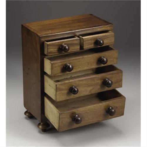 <B>A Victorian Walnut Miniature Chest of Drawers</B></I><BR>Unknown maker, England<BR>Mid to Late Nineteenth Century<BR>Walnut<BR>Unmarked <BR>12.5 inches high x 9.75 inches wide x 5.25 inches deep<BR> <BR>Of five drawer form, with two drawers above four drawers with turned knob pulls, on turned toupee feet.<BR><BR><b>Shipping:</b> Miscellaneous Collectibles, Larg (<a target="_blank" href="http://www.heritageauctions.com/common/shipping.php">view shipping information</a>)