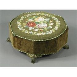 A Victorian octagonal footstool with a needlework seat on four lacquered bronze