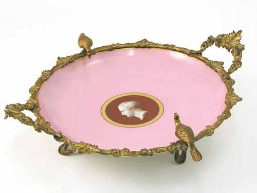 A Victorian ormolu mounted porcelain dish, centrally painted with a portrait of Prince Albert on a pink ground within a rococo scroll two handled mount with cast birds on scroll feet 14 ins £140-180