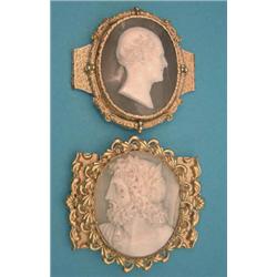 A Victorian oval shell cameo carved with a classical male profile, in yellow metal buckle mount, together with another similar bracelet clasp £150-200