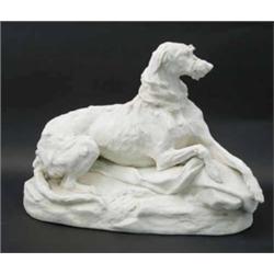 A Victorian parian model of a dog, lying facing forward, (neck repaired) 13.5ins £80-120