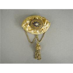 A Victorian pinchbeck memorial brooch inset with a seed pearl, with enamel, wirework and foliate decoration, with a tassel drop, 7cm long, 5cm wide Est. 200/300
