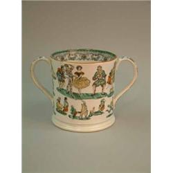 A Victorian pottery loving cup, printed with comical figures, 8ins £200-300