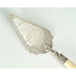 A Victorian presentation trowel with ivory handle, the blade with leaf and scroll engraved border...