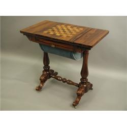 A Victorian rosewood games/worktable, the sliding top enclosing a backgammon board with a gilt...