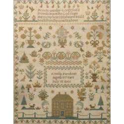 A Victorian sampler, finely worked with verse, house, sailing ship, temple and many motifs, within a strawberry border, by Amelia Fawkner, 13 years, 1846, framed 1ft 5ins x 1ft 2ins £300-400