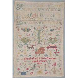 A Victorian sampler, worked with numerals, alphabet, animal, bird and floral motifs by Elizabeth E.A. Belchamber, aged 9, 1859, unframed 1ft 4ins x 1ft 1in £200-300