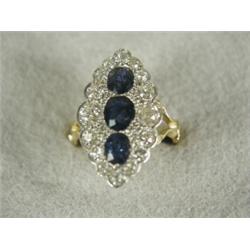A Victorian sapphire and diamond marquise ring in a yellow gold engraved shank with split shoulders, size N Est. 800/1000