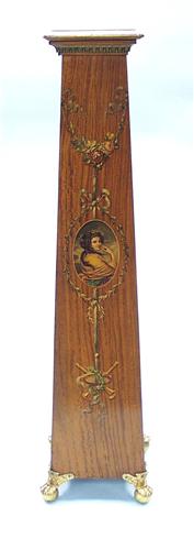 A Victorian satinwood pedestal. The columnar tapered sides are decorated with hand painted portraits and floral motives. With square top. Raised on lion's paw feet. 48" high.