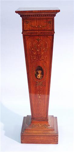 A Victorian satinwood pedestal. The columnar tapered sides are decorated with oval medallions and hand painted portraits amongst floral motifs. 13" square top. Raised on pyramidal base. 44 1/2" high.