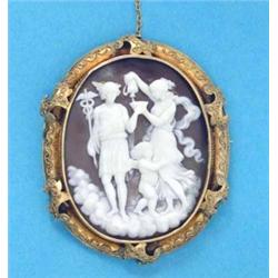 A Victorian shell cameo brooch, carved with a classical study of Mercury and attendants, in a gol...