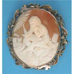 A Victorian shell cameo brooch, carved with a study of a seated putti scribe, in gold scrolled fr...