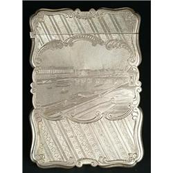 A Victorian silver card case of shaped outline, the front engraved with a view of Somerset House across from Blackfriars Bridge, within a scroll panel between diagonal engine turned bands, the back similarly engine turned and with a cartouche inscribed 'Georgianne Mead a Birth day present from her uncle James Mead Jan'y 7th 1854', Birmingham 1847 by Nathaniel Mills, 10 x 7 cm (4 x 2.75 in)