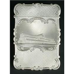 A Victorian silver card case of shaped outline, the front engraved with a view of the Crystal Palace, within a scroll panel and engine turning, the back similarly engine turned and with a monogrammed cartouche, Birmingham 1850 by Nathaniel Mills, 10 x 7 cm (4 x 2.75 in)