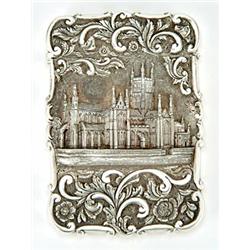 A Victorian silver 'castle top' card case, of shaped outline, the front chased with a view of Worcester Cathedral between leaves and 'C' scrolls, the back embossed with foliate scrolls on a matt ground and a cartouche with 'Mary Stevenson', Birmingham 1845 by Nathaniel Mills, 10 x 7cm (4 x 2.75 in)