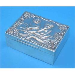 A Victorian silver cigarette box, the lid embossed with a monkey and a young boy within a foliate...