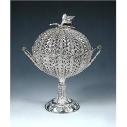 A Victorian silver cup and cover by Joseph Angell and Joseph Angell, London 1841, the two handled hemispherical bowl and matching cover allover pierced with anthemion scroll decoration, raised on an acanthus and stiff leaf decorated pedestal, the cover with flower finial, 21cm high, 19.5oz £250-350