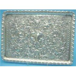 A Victorian silver dressing table tray decorated with cherub musicians, scrolls and birds, 14ins, Maker William Comyns, 1899, 15oz. £250-300