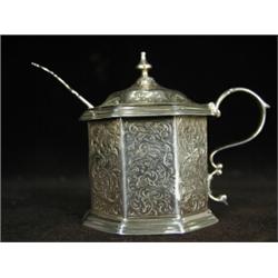A Victorian silver hexagonal mustard pot chased with scroll work decoration, 1859, and a mustard...