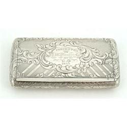 A Victorian silver oblong snuff box with flush hinged cover engine turned and engraved with foliate scrolls and a presentation inscription dated 1853, Birmingham 1851 by Yapp & Woodward, 8cm (3.25 in)