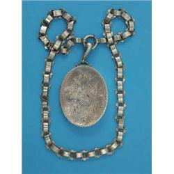 A Victorian silver pendant locket, the front engraved flowers and a butterfly, on fancy link chain £70-100