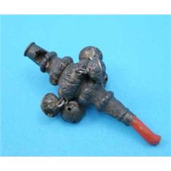 A Victorian silver rattle, with 5 bells, whistle and coral teether....