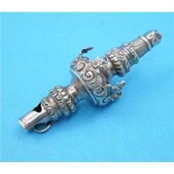 A Victorian silver rattle, with whistle, lacking bells and teether. £80-120