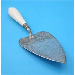 A Victorian silver trowel, with ivory handle and scroll engraved blade....